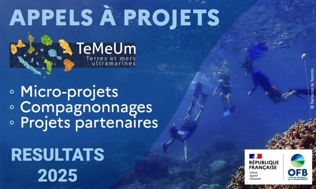 L’OFB ainsi que les partenaires de TeMeUm, sont heureux de présenter les 32 projets lauréats TeMeUm 2025 : 23 micro-projets, 6 compagnonnages et 3 projets partenaires en faveur de la biodiversité ultramarine pourront voir le jour avec le soutien de TeMeUm.