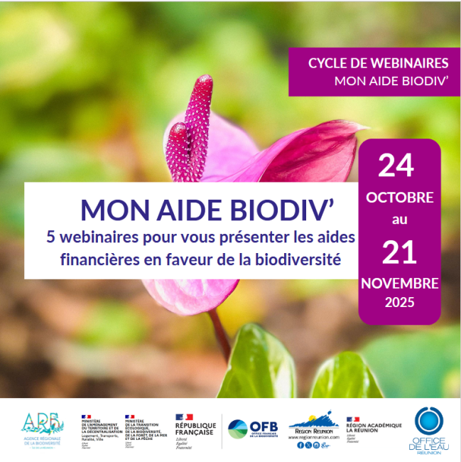 L’Agence Régionale de la Biodiversité de La Réunion vous invite à participer au cycle de webinaires Mon Aide Biodiv’, organisé du 24 octobre au 21 novembre 2025.