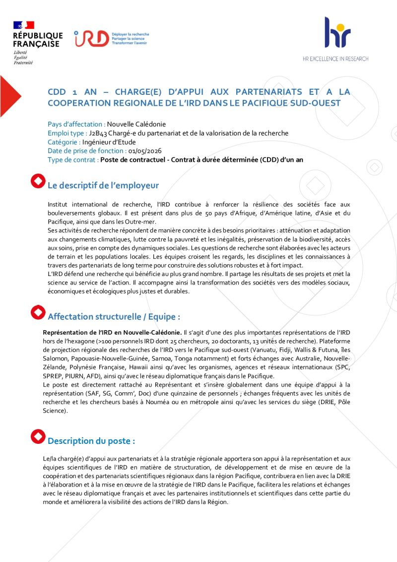 CV + lettre de motivation à envoyer à : rh-nc@ird.fr