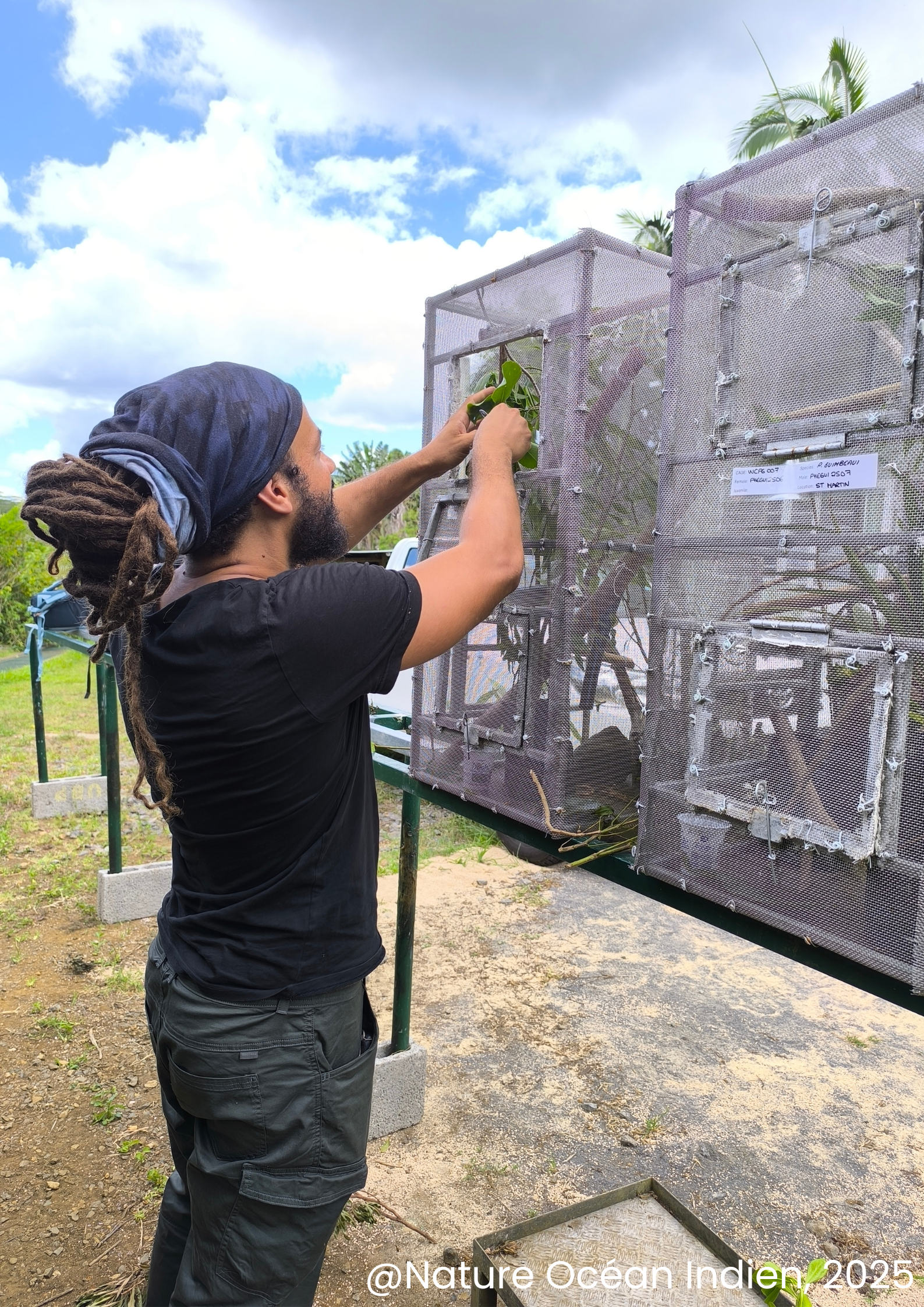 Encadrés par l’équipe de conservation, Ulrick et Joshua ont participé aux opérations de gestion de la faune en prenant part au nourrissage des animaux (oiseau vert à lunette, geckos, scinques, tortues), aux suivis (tortues géantes d’Aldabra, escargots), à des entrainements au nourrissage des perruches vertes, à l’entretien des élevages d’insectes et de souris, ainsi qu’au piégeage des prédateurs.