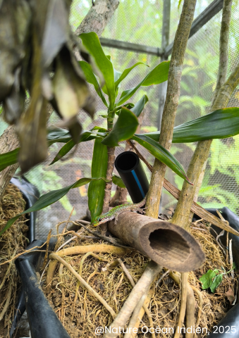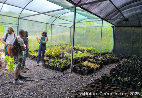Ce projet s’est concrétisé en décembre 2025 avec l’immersion de deux salariées de NOI au sein d’Ebony Forest : Ulrick Fontaine, chargé d’étude en restauration écologique, responsable de la production végétale, et Joshua Favé-Le Gall, chargé de mission pour la lutte contre les EEE. Ils ont alors découvert un processus de restauration écologique ambitieux, souhaitant réhabiliter les interactions écosystémiques forestières en s’appuyant sur la faune indigène (escargots, oiseaux, reptiles, tortue géante).
